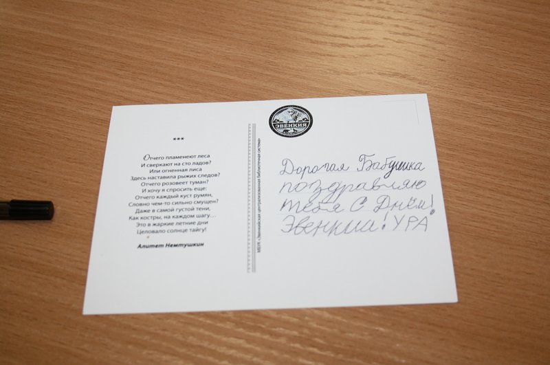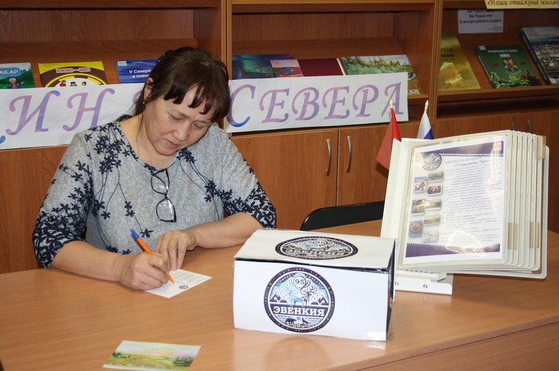 В читальном зале Трошевки были подготовлены 8 видов поздравительных открыток. Лицевая сторона открыток была представлена работами талантливых эвенкийских художников и юных дарований Эвенкийской районной детской школы искусств, передавших красоту и самобытность края. Обратная сторона открыток была наполнена проникновенными стихами местных поэтов, а рядом каждый желающий мог оставить свои самые теплые и искренние слова.