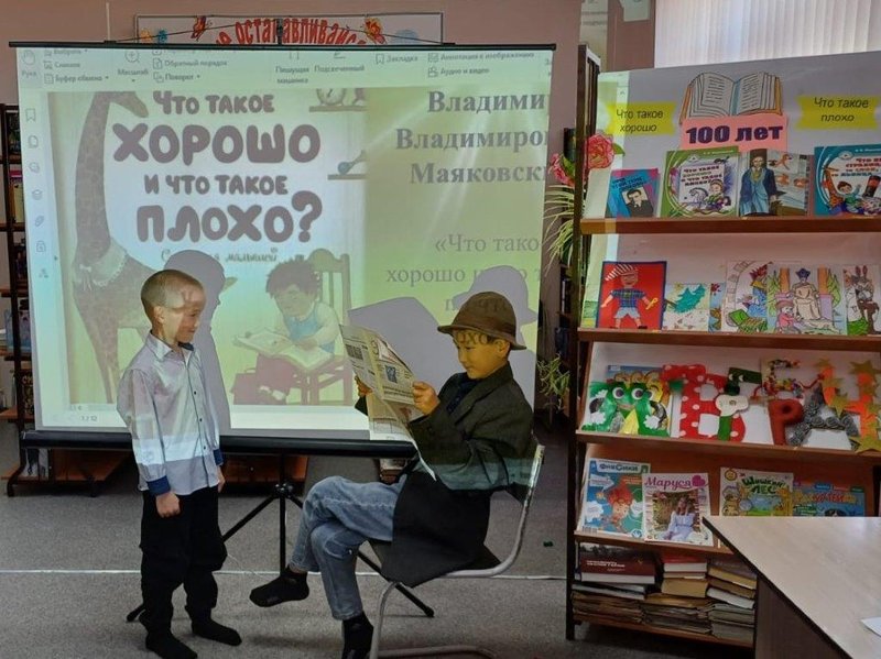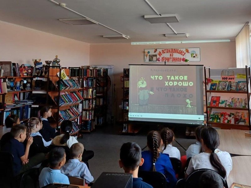 В библиотеке п. Чиринда для знакомства с автором и стихотворением была показана презентация «В.В. Маяковский. Что такое хорошо и что такое плохо» и советский рисованный мультипликационный фильм,созданный в 1969 году. С помощью нейросети был создан ролик, где автор читает стихотворение. Затем ребята участвовали в викторине «Что такое хорошо», в играх «Хорошо – плохо», «Да или нет» и «Не попади впросак».