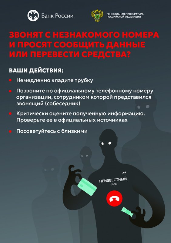 Генеральной прокуратурой РФ совместно с Банком России разработаны цифровые плакаты в целях повышения уровня информированности населения о действиях лиц, вводящих в заблуждение в целях хищения денежных средств.